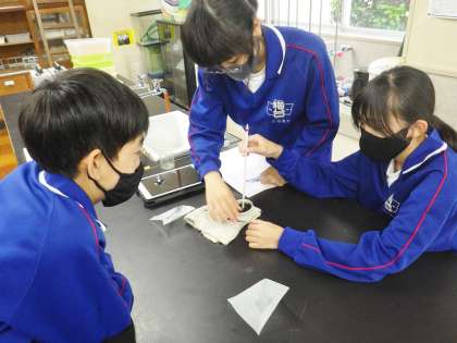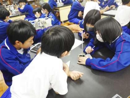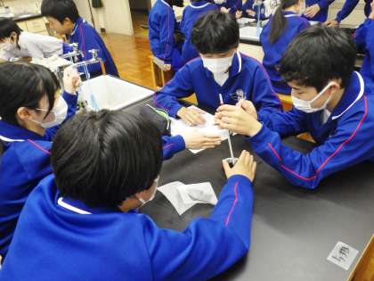 22学級は、理科の「化学変化と熱の出入り」の授業の様子です。学習課題「化学変化によって熱が出るのか」について、実験を行って検証していました。「予想より上がってきたぞ!」「どこまで上がるのかな?」と温度計を見ながら呟いていました。