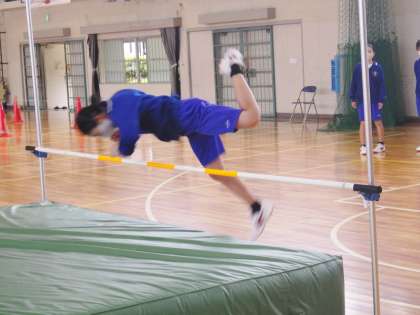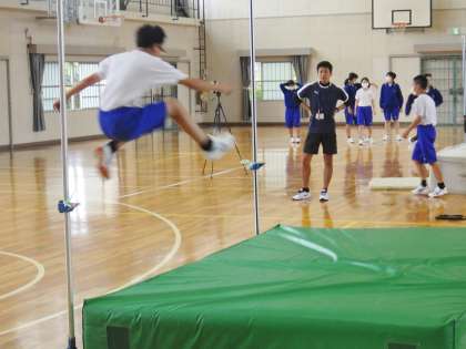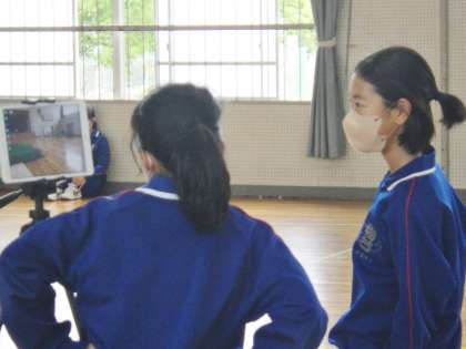 23学級は、体育の「走り高跳び」の授業の様子です。ベリーロールとはさみ跳びを行っていました。跳んでいる姿を学習用タブレットで撮影し、踏み切り、空中動作などを確認していました。自分の跳ぶ姿を映像で見ながら「腕の振り上げ方を直そう」と視覚で確認した後、何度も練習していました。