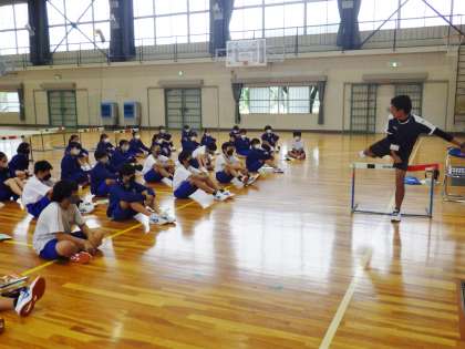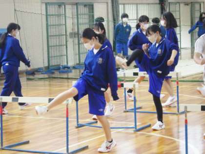 13学級は、体育の「ハードル走」の授業の様子です。生憎の雨のため、体育館でハードルを跳ぶときの足のあげ方、跳ぶときの体の向きなどを確認していました。