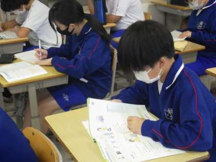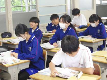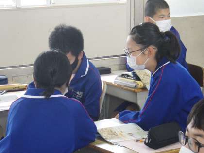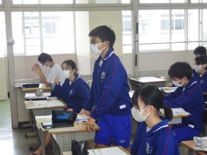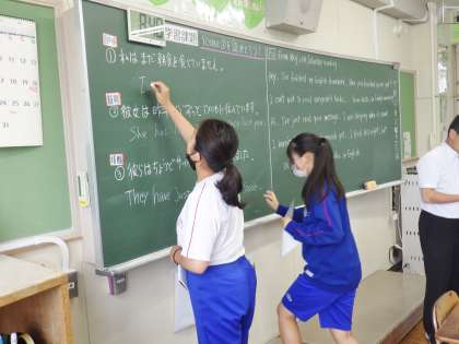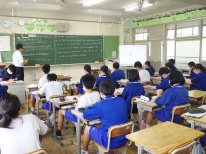33学級は、英語の「現在完了形を使った英文の読み取り」の授業の様子です。授業の最初に、前時に学習した内容の問題を解きながら、解き方・考え方の復習をしていました。