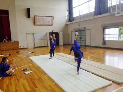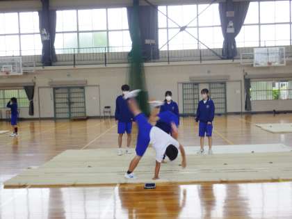 34学級は、体育の「マット運動」の授業の様子です。グループの発表会で器械体操のどんな技を使うかについて話し合っていました。話し合いがまとまったグループから練習を行っていました。