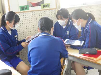 33学級は、音楽の「ブルタバ(モルダウ)」の授業の様子です。好きな場面の紹介文について話し合っていました。「どの場面について話し合っているの?」と聞くと「結婚式の場面です。この場面は優しい音で結婚式の場面が浮かんできます」と返ってきました。情景を思い浮かべながら鑑賞ができていると感じました。