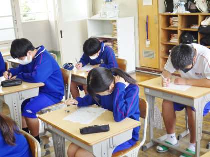 34学級は、社会の「現代の日本と私たち」の単元テストの様子です。一問一問集中して解いていました。