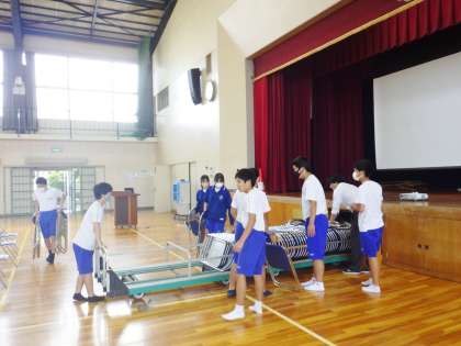 3年生が体育館の会場準備を行っている様子です。
