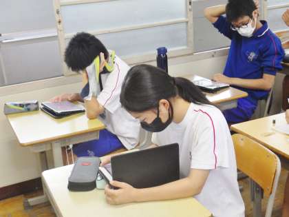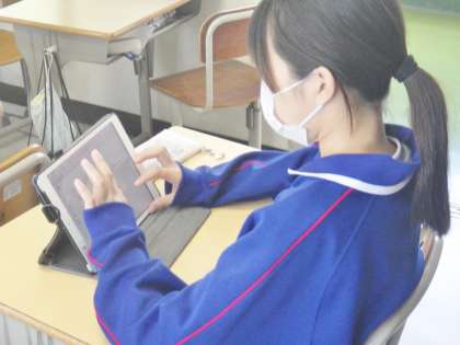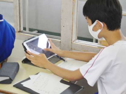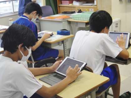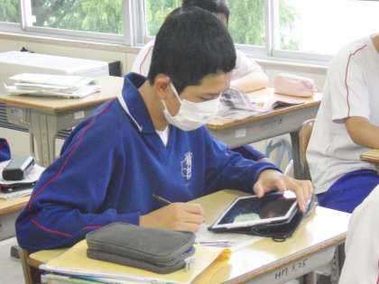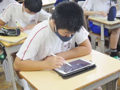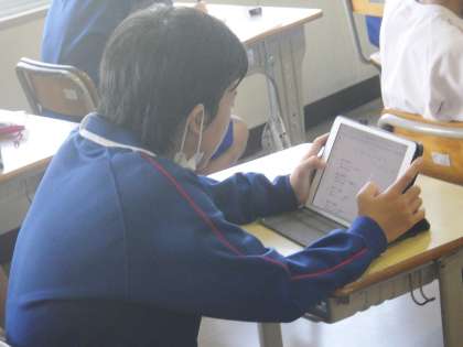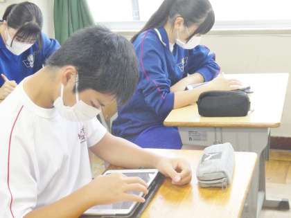 12学級は、社会の「人類の出現と進化」の授業の様子です。デジタル教科書の映像を見て人類の進化について確認した後、ポイントをノートにまとめ理解を深めていました。