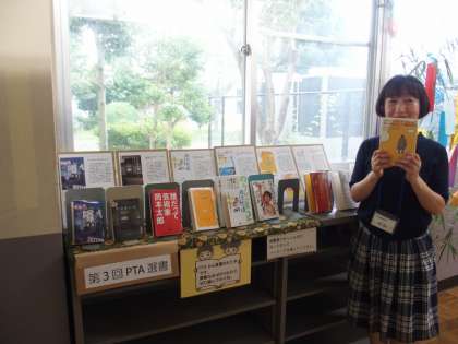 先日、会員の皆様に推薦していただいたPTA選書の準備が整い、6月30日に司書の光岡さんが図書室前の特設コーナーに配架してくださいました。