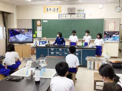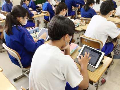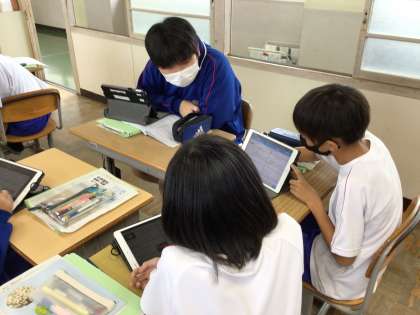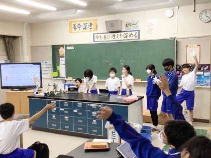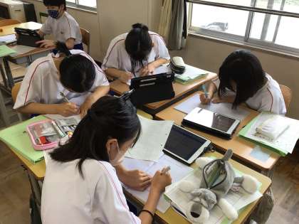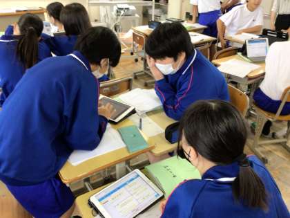 13学級は、理科の「いろいろな物質」の授業の様子です。前時に行った実験の結果を、学習用タブレットを用いてまとめ、それをグループで共有することで、実験で調べた白い粉末の正体について考えました。