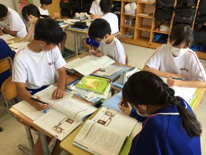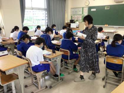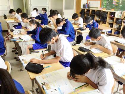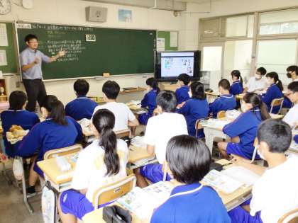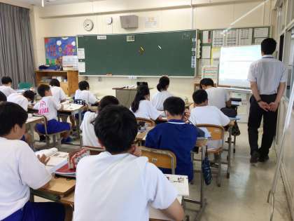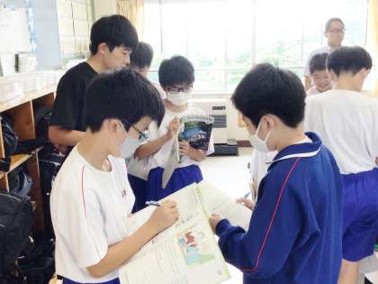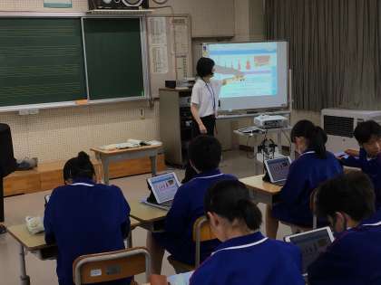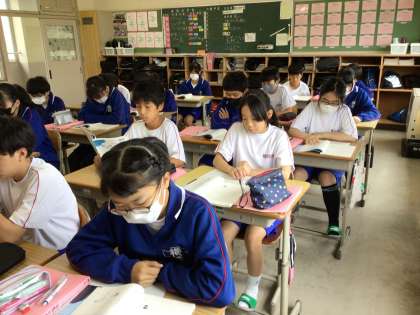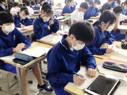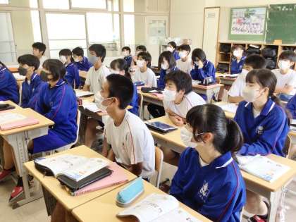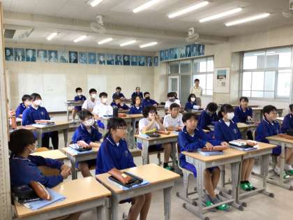 14学級は、英語の「Unit4〜時刻をたずねたり答えたりしよう〜」の授業の様子です。「What time〜?」を使って、級友に様々な質問していました。返ってきた内容に思わず笑みがこぼれる場面もあり、楽しみながら英会話を学んでいることが伝わってきました。