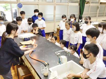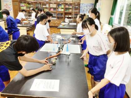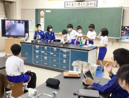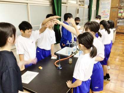 13学級は、理科の「物資のすがた」の授業の様子です。ガスバーナーの使い方を教科担任の説明を聞いた後、ガスバーナーに火をつけていました。「マッチを擦るのは難しい」という声が聞こえてきました。空気調節ねじを開き、炎の色が青く変わると、拍手が起こっていました。