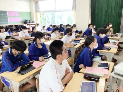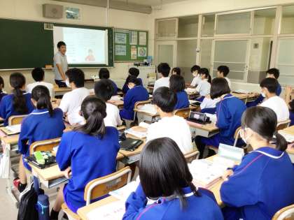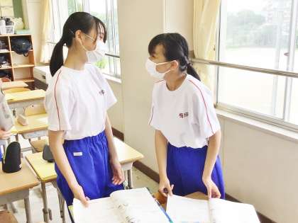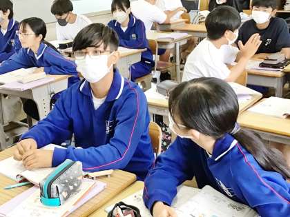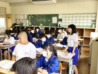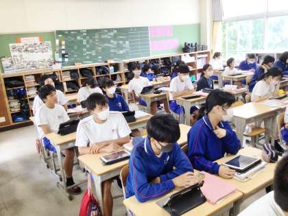 21学級は、英語の「Unit3」の授業の様子です。不定詞について学習していました。「surprised to〜」「sorry to〜」の意味について、級友と話し合っていました。話し合い後は、自分の考えを自信をもって発表していました。