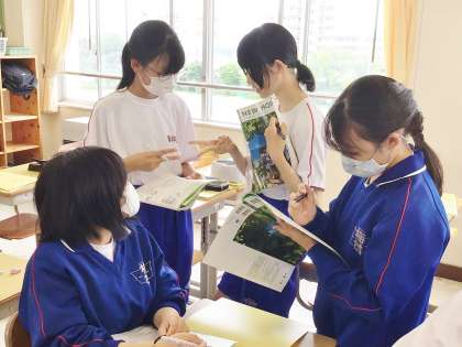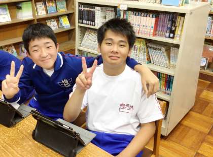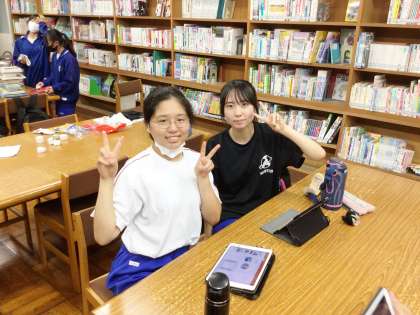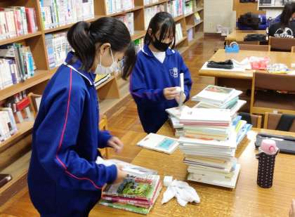 ボランティア部の活動の様子です。ボランティア部は、7月4日(木)の文化部発表会で、今までの活動をスライドを使って紹介する予定です。図書室でスライド作成と本をきれいに拭く活動を行っていました。