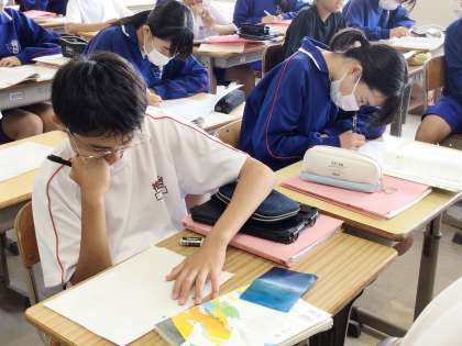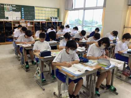33学級は、社会の「社会集団の中で生きる私たち」の授業の様子です。対立と合意について、教科担任の説明を聞いた後、大切なポイントをノートにまとめていました。
