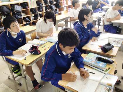 14学級は、数学の「文字の式のまとめ」の授業の様子です。今までに学習してきた内容を思い出しながら、様々な練習問題を解き、グループで確認することで理解を深めました。