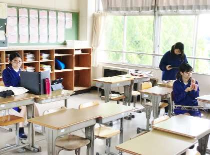 12学級は、音楽の「鑑賞」の授業の様子です。ヴィヴァルディの「春」を聴いて、使用している楽器や繰り返し出てくるフレーズを確認することで、曲のイメージをつかみました。その後、学習用タブレットを用いて、曲の表現の工夫についてまとめました。