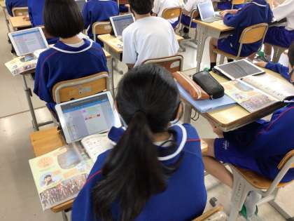 31学級は、家庭科の「幼児のころと今の自分」の授業の様子です。幼児の生活習慣について、自分の考えを学習用タブレットにまとめていました。