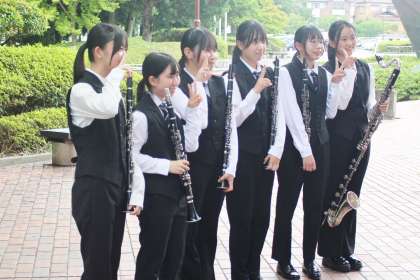 吹奏楽部が26日(金)に行われた愛知県吹奏楽コンクール西三河北地区大会に参加し、見事な演奏を披露しました。写真は、演奏が終わり、緊張から解放された場面です。