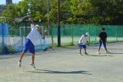 男子ソフトテニス部は、3年生が30日から始まる県大会に備えて練習試合に出かけており、校内では1・2年生が練習していました。顧問の先生がコートに水を撒いて、少しでも温度が下がるように工夫していました。