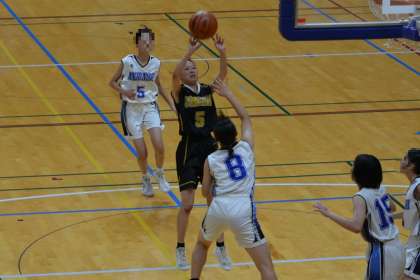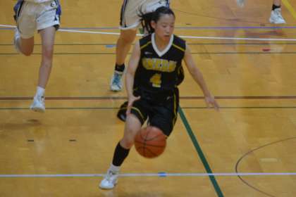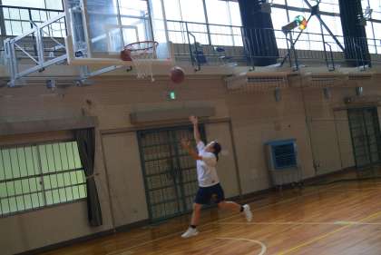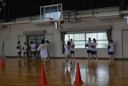 体育館では女子バスケットボール部が活動をしています。地域部活動指導員の方が2名来校され、基礎練習を行っていました。 -