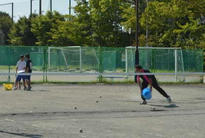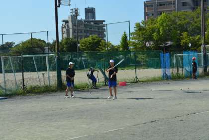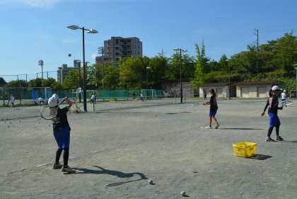 暑い日が続いていますが、朝から運動場ではソフトテニス部が活動を行っています。女子ソフトテニス部は、1・2年生が基礎練習を行っていました。