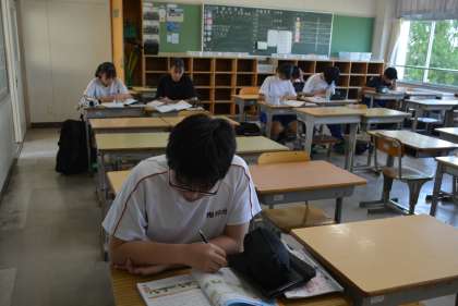 今日はサマーチャレンジ(夏休み中の学習会)が行われています。希望制で事前に申し込んだ生徒が登校し、夏休み課題を進めながら基礎的な内容の復習を行っています。