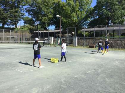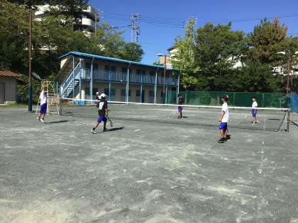男女ソフトテニス部の様子です。暑さ対策で、朝7時から練習を行っています。 -