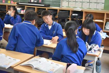 教科書の問題に対して、グループで相談しながら解法を見つけています。 -
