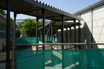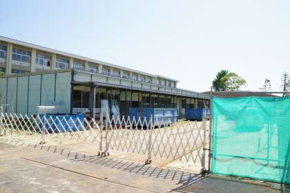 5月に入り、交流館との合築工事に伴って運動場に建っていた仮設技術棟(プレハブ校舎)の解体作業が始まりました。