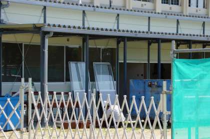 振り返れば、2年以上もお世話になったプレハブの教室です。技術科の授業だけでなく、体育祭の救護室、体育祭や音楽発表会に向けての練習場所、入学説明会、先生たちの会議等々、様々なことでお世話になりました。