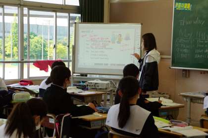 <写真上>ホワイトボードにプロジェクターで画像照射。ボード上で重ねて文字も書けるので、第2の黒板ですね。もちろん、正面の黒板も同時活用です。