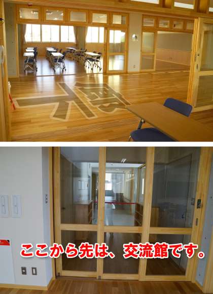 昨年度末3月26日に、新しくなった若園交流館の竣工式がありました。本校との合築となり、交流館と本校とのつなぎ目の所が新しい技術科棟です。今回はその2階部分を紹介します。「多目的室」1と2です。教室棟の2倍の広さの廊下を挟んで両側に配置されています。