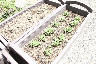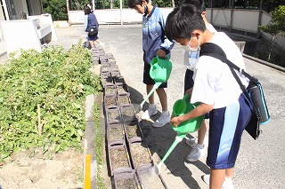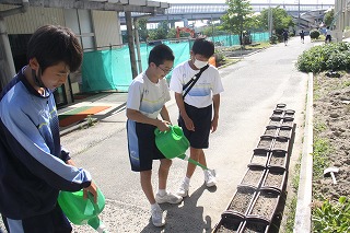 2年生は技術の授業で小松菜を育てています。毎朝欠かさず順番に水やりをしています。
