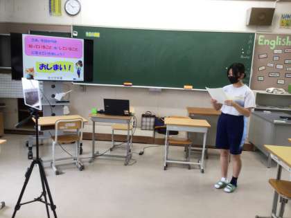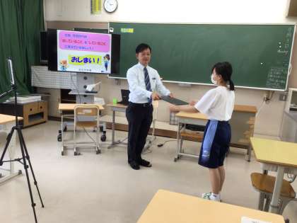 例年全校集会の形で実施してきましたが、暑さ対策としてオンラインで行いました。