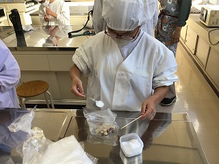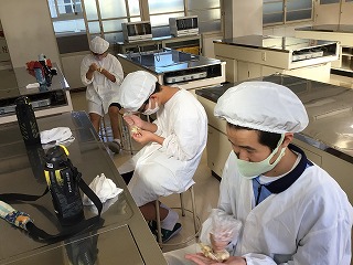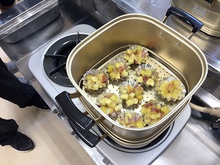 先日吉原ファームの方々と収穫したさつまいもを使い、家庭科の時間に「鬼まんじゅう」を作りました。さつまいもに砂糖、小麦粉を順に入れてその都度よく揉み、カップにいれて蒸しました。砂糖は自分で量り、揉むときは浸透圧がうまく利用できるように、自分たちで工夫して作りました。作ったものはみんなで美味しく頂きました。