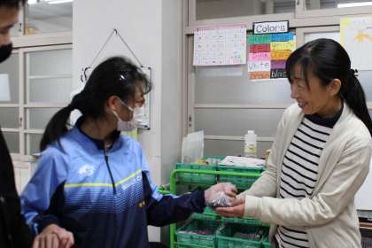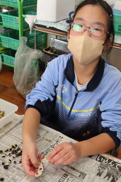 例年は緑色の枝豆の状態で収穫していましたが、今年は収穫のタイミングを少し遅らせたこで、黒豆になりました!生徒たちが、ひとつひとつさやの中から手作業で取り出しました。生徒がグラムを量り、袋詰めもして販売しました。