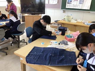 すそをまつり縫いするために、一生懸命取り組んでいました。