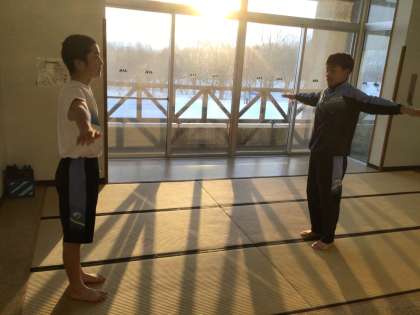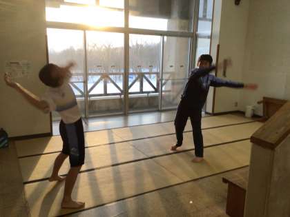 余裕をもって起床した生徒たちが居間に集まって放送に合わせて体操していました。