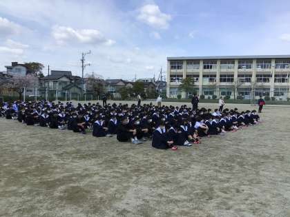 各クラスで避難経路の確認と火事と地震での対応の違いなど、事前指導を受けてから、実際にグランドへ全員避難しました。