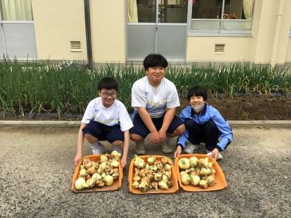 教室前の畑に植えた玉ねぎの収穫を始めました。まずは第1弾の収穫です。