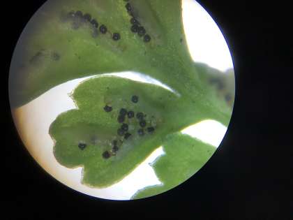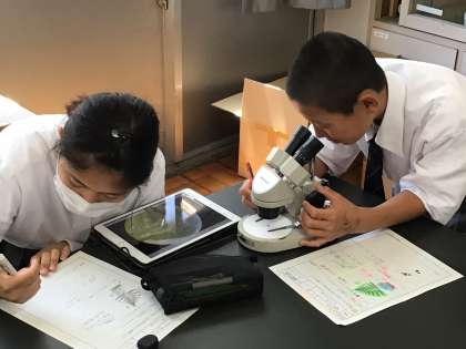植物の学習では、シダ植物やコケ植物を観察したり、植物の分類についてカードで学習したりしました。身近な植物の意外な姿や、仕組みについて驚いているようすでした。写真は、生徒たちの学習のようすと、生徒が撮影したシダ植物の胞子のうです。