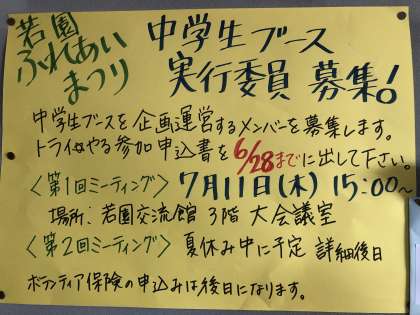令和6年9月29日(日)に実施される若園ふれあいまつりで、中学生ブースの企画・運営するメンバーを募集します。
