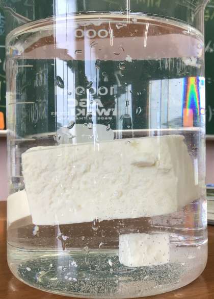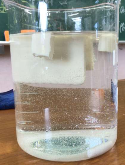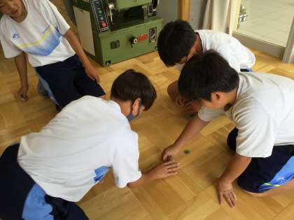 理科の授業では、金属の性質である「たたくとのびる。たたくとひろがる。」を学習するために王冠めんこを作ったり、密度の学習をするために「とうふの浮き沈みの謎」について考えたりしました。生徒たちは、みそ汁のとうふの様子と関連付けて考えていました。