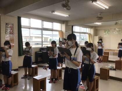 3年生の音楽の授業の様子です。3年生にもなると、迫力ある歌声や綺麗なハーモニーがより増してきます。秋の合唱発表会がより楽しみになりました。竹田先生は、歌が苦手な生徒にも、体を使いながら歌う方法を紹介するなど、分かりやすく指導されます。また、個別の課題や学級の課題を明確にして、歌唱力をあげてくれます。個別最適な学びや協働的な学びに繋がる1時間でした。