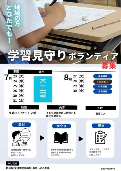 夏休みの始めと終わりに、若園交流館の一室を使って学習解放を行います