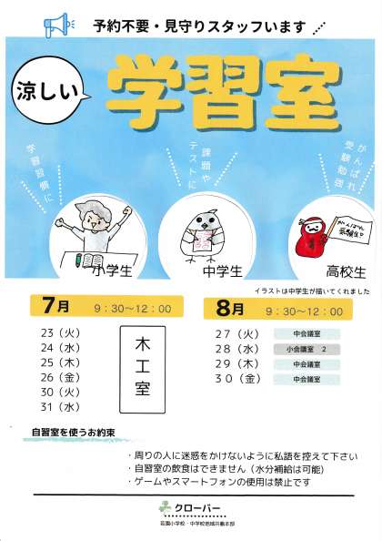 夏休みに交流館の一室を使って「クールシェアルーム」として開放します。