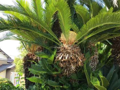 校内のソテツが、雄花と雌花をそれぞれ咲かせました。