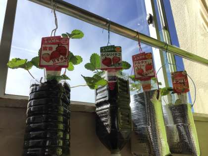 ハートラウンジの教室後方窓際の手すりで、いちご栽培を始めました。
