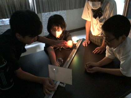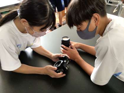 「カメラのふしぎを解明しよう」をテーマに、1年生の理科ではカメラについて学習を行っています。ファインダーから見ると普通に景色が見えるのに、フィルム(スクリーン)に倒立画像が映るふしぎについて、探究しています。3枚目の添付写真は「倒立画像の原因は、レンズの1枚目にある凸レンズではないか」と仮説を立てて、凸レンズのみで実験しているようす。凸レンズのみで倒立画像ができると、各クラス「お〜。すげ〜。1枚だけでいいのか。」と、感動しているようでした。