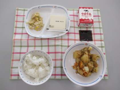 今日の給食は『ごはん、牛乳、じゃがいもとツナのうま煮、湯豆腐、れんこんサラダ、みそたれ、和風ドレッシング』でした。