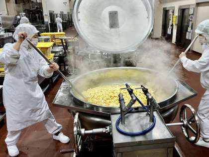 調理員さんが一つ一つ丁寧に切ったじゃがいもを、スパテラという調理器具で混ぜています。