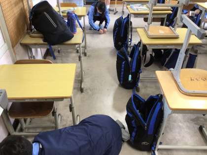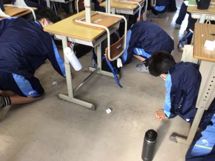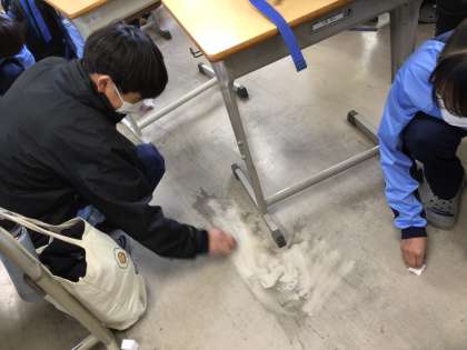 1年3組の学級会で、「教室の床を汚してたままにしている」ことが問題の1つとしてあがり、これから学級で「12月中に床をきれいにしよう」という取り組みが始まりました。写真は給食後にみんなで床を磨くようすです。
